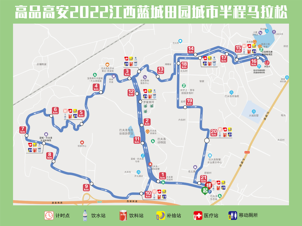 组委会沿环形赛道每2.5公里和起终点处设置补给站,给选手提供饮料、饮水和能量补给,补给站前有明显的标志。